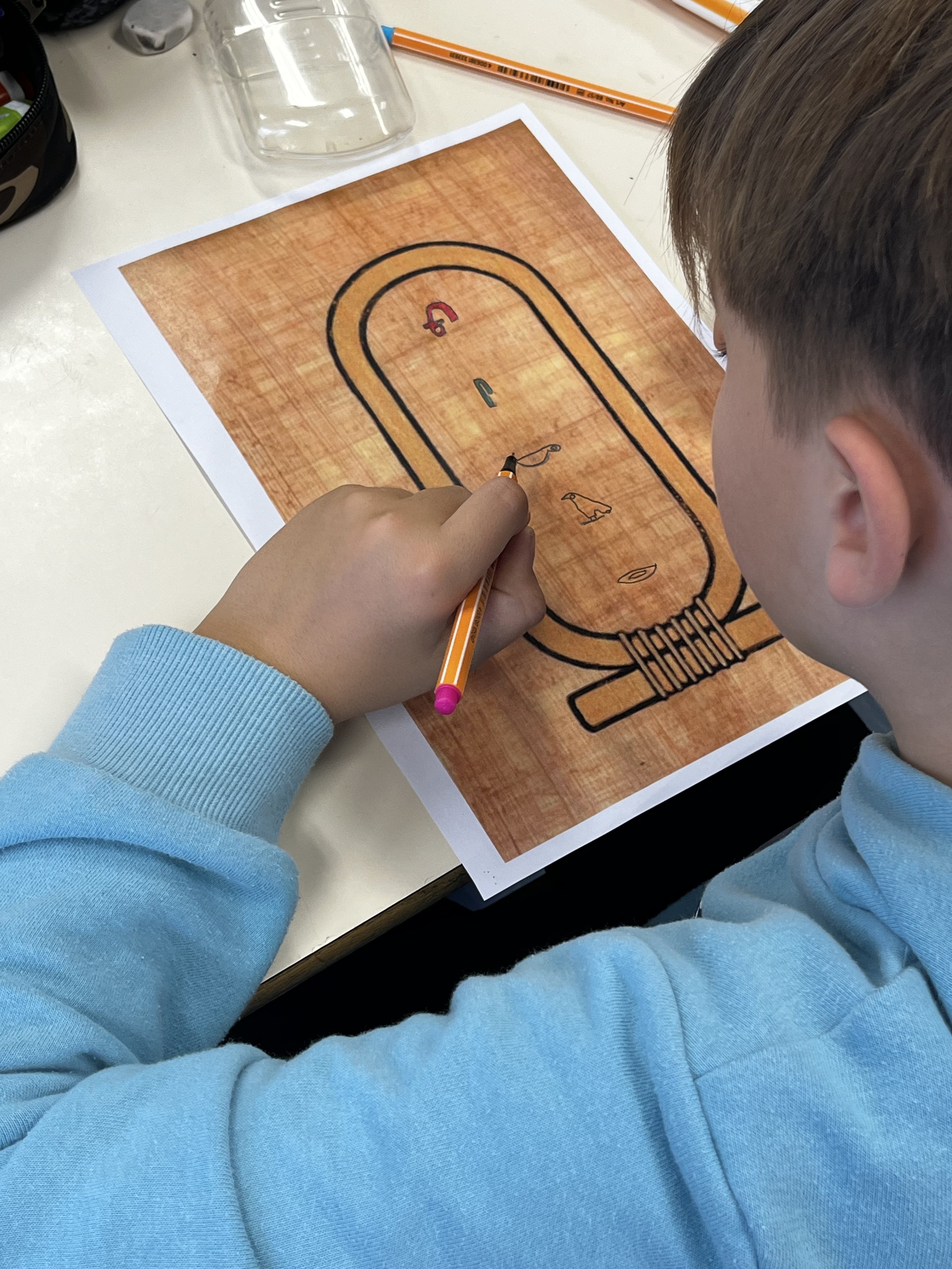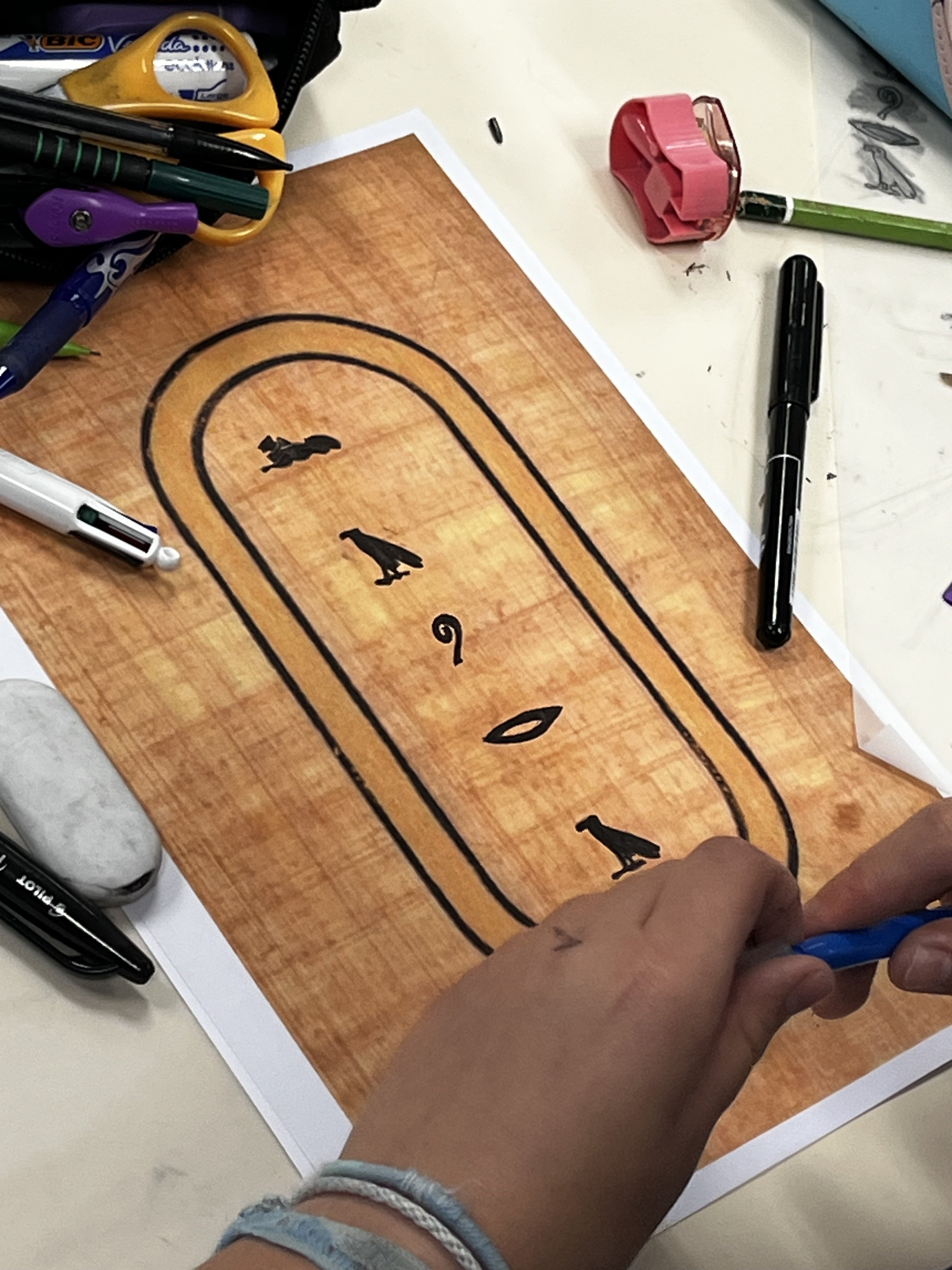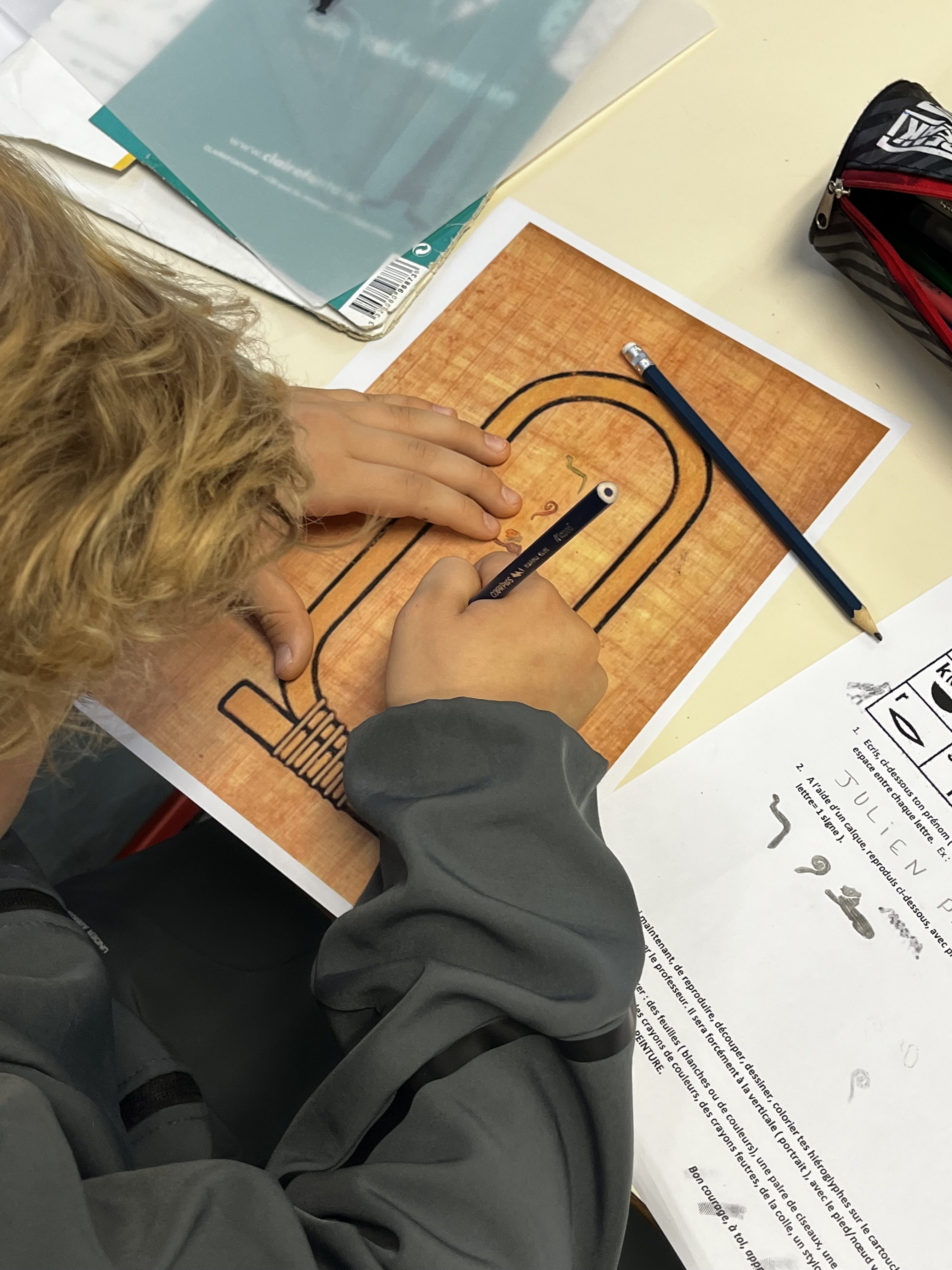 Lors d’une première séance d’une heure, ils se sont "essayés", sur des facsimilés de papyrus, aux hiéroglyphes, apparus en Egypte, réalisant pour certains, de véritables œuvres d’art, comprenant mieux le travail de traduction réalisé avant eux par le français Jean François CHAMPOLLION, en 1822, grâce à la pierre de Rosette, découverte dans le delta du Nil.